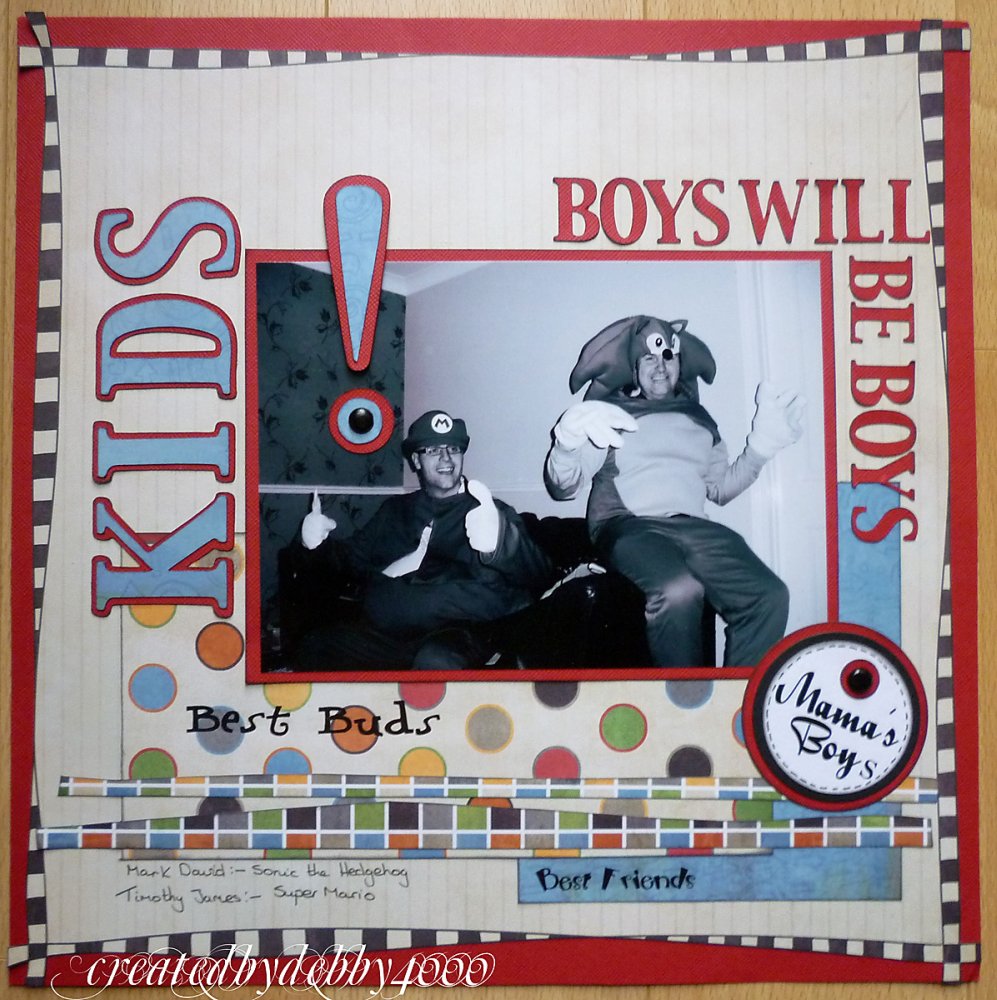 Some kids just don't grow up. Somehow my nephew picked up some costumes and they had to try them out. Not sure how but I don't have a colour pic of them together only this b/w one but that could be just has well. The colours are very bright blue and red and I don't have any scrapbook papers that would match.