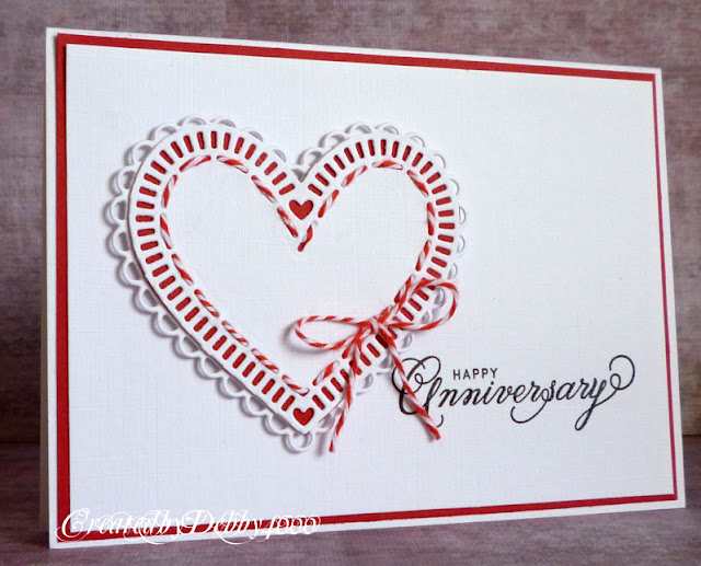 Now to my card isn't this heart fabulous, it arrived a few days before Christmas and I so wanted to play and I needed an Anniversay card. The Doily heart is from Simon Says Stamps, I cut it out twice but the second one I chopped of the scallop edge and drew round it to make the red mat underneath. The middle cried out for either ribbon or twine, it makes quite a statement. The beautiful scripted sentiment is also from Simon Says Stamps Perfect Love which I think will turn into a firm favourite.